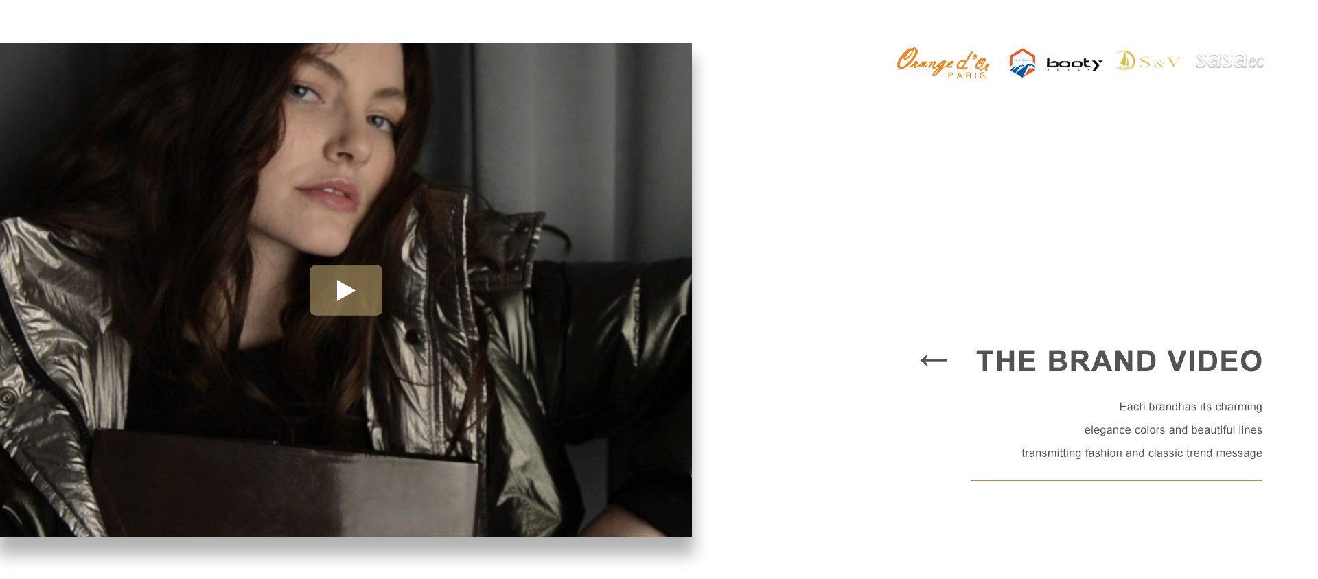 品牌建設(shè)是公司堅(jiān)持不懈的追求,我們每年都會(huì)積極參加國內(nèi)外舉辦的各大服裝展銷會(huì)。憑借著良好的質(zhì)量與信譽(yù),市場占有率在逐漸擴(kuò)大,產(chǎn)品遠(yuǎn)銷歐洲、美洲、亞洲等國。公司以生產(chǎn)棉衣、羽絨服、派克、大衣、夾克、運(yùn)動(dòng)休閑服飾等為主,旗下主打品牌有 ORANGE D’OR 、CLAIRVAL、BOOTY JEANS 、S&V和SASAEC,各品牌服飾均以典雅的色彩、優(yōu)美的線條、卓越的魅力吸引著都市麗人,將時(shí)尚、經(jīng)典的潮流信息予以淋漓盡致的演繹。